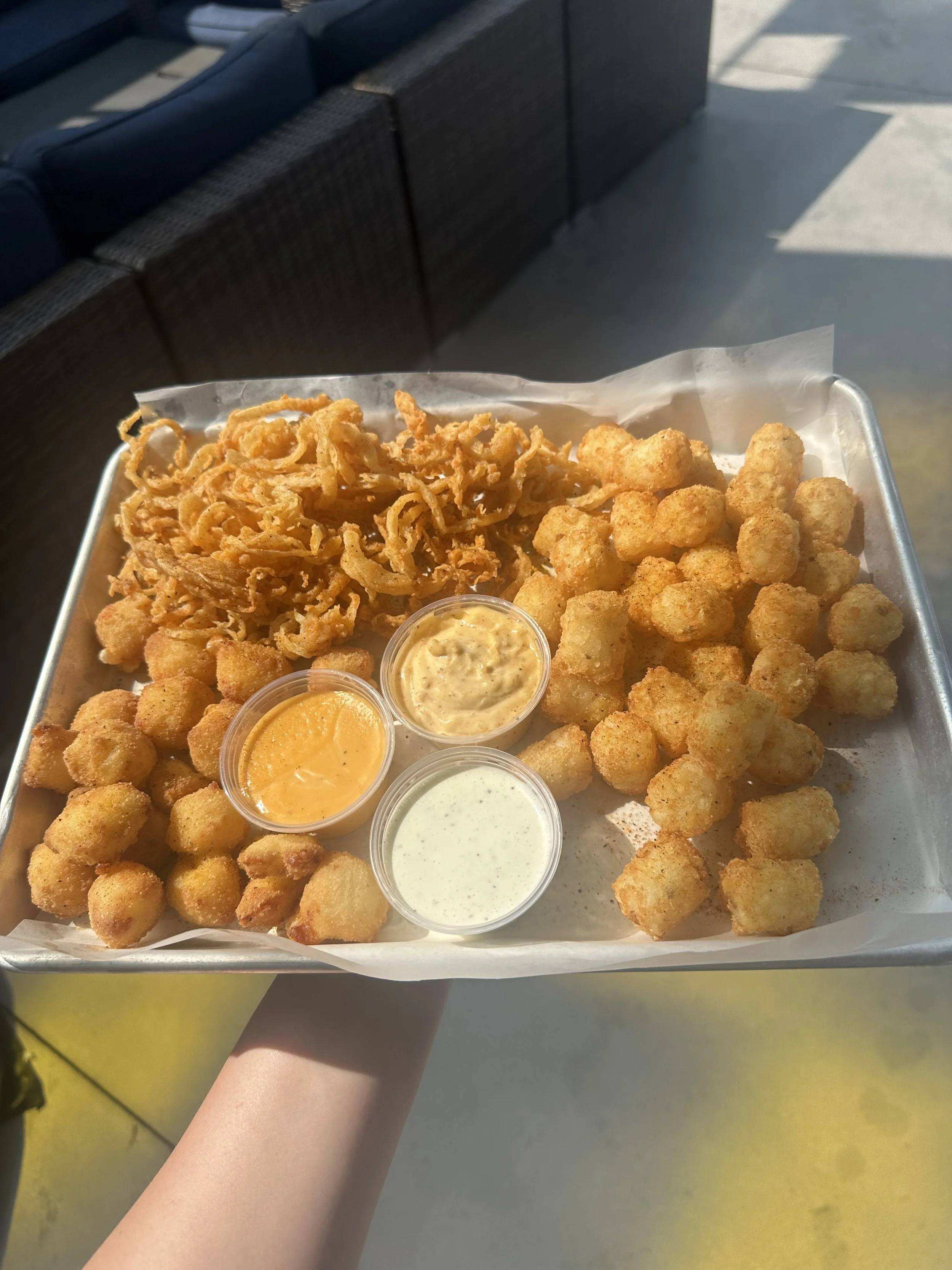 An appetizer sampler with haystack onion rings, Wisconsin cheese curds, and tater-tots all seasoned with our Prairie Fire seasoning, served with 3 sauces of your choice.