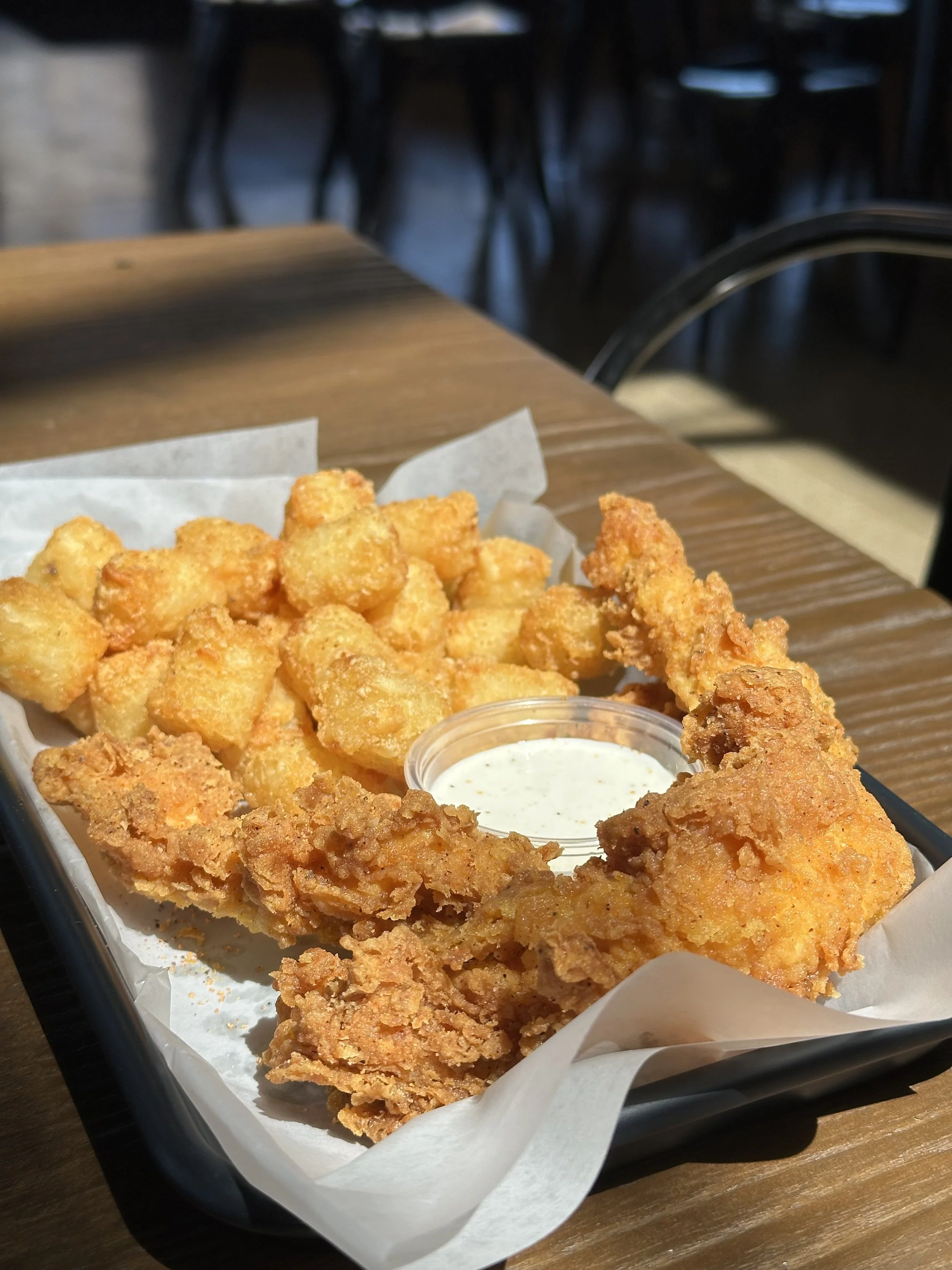 Fresh chicken hand dipped in our Lucchini Lager beer batter served with sauces of your choice and tots. They come in kids, adult, and shareable sizes!
