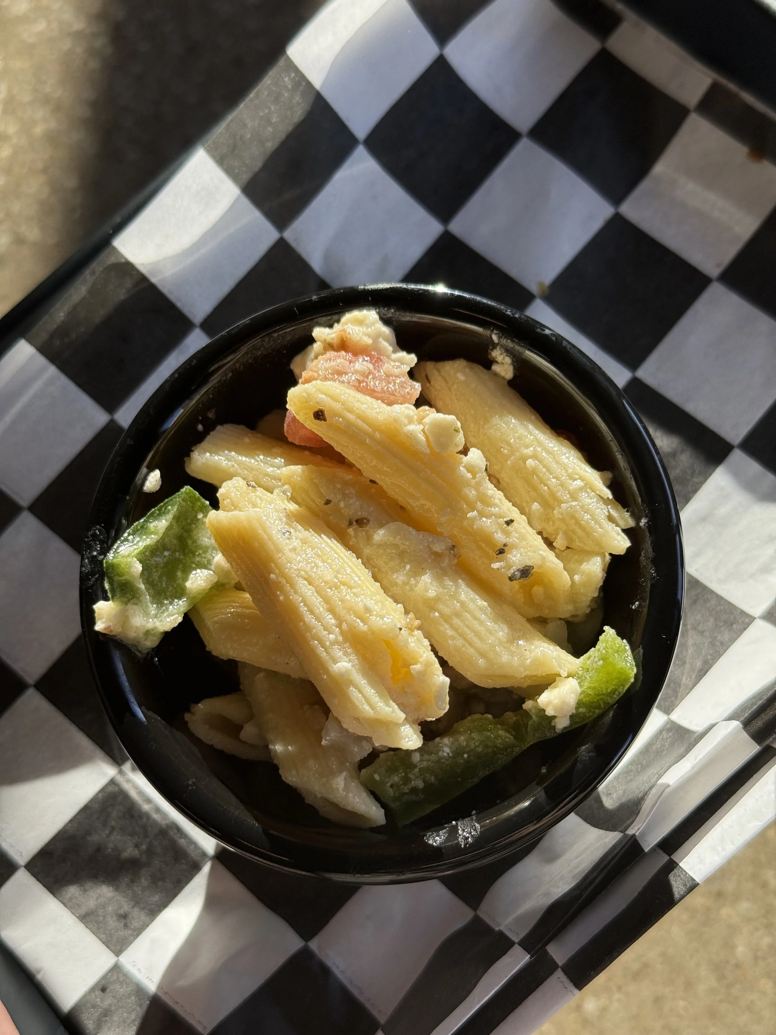 Penne pasta tossed with tomatoes, cucumbers, onions, green peppers, and feta in a seasoned olive-oil dressing for a fresh Mediterranean-style salad.—$2.50