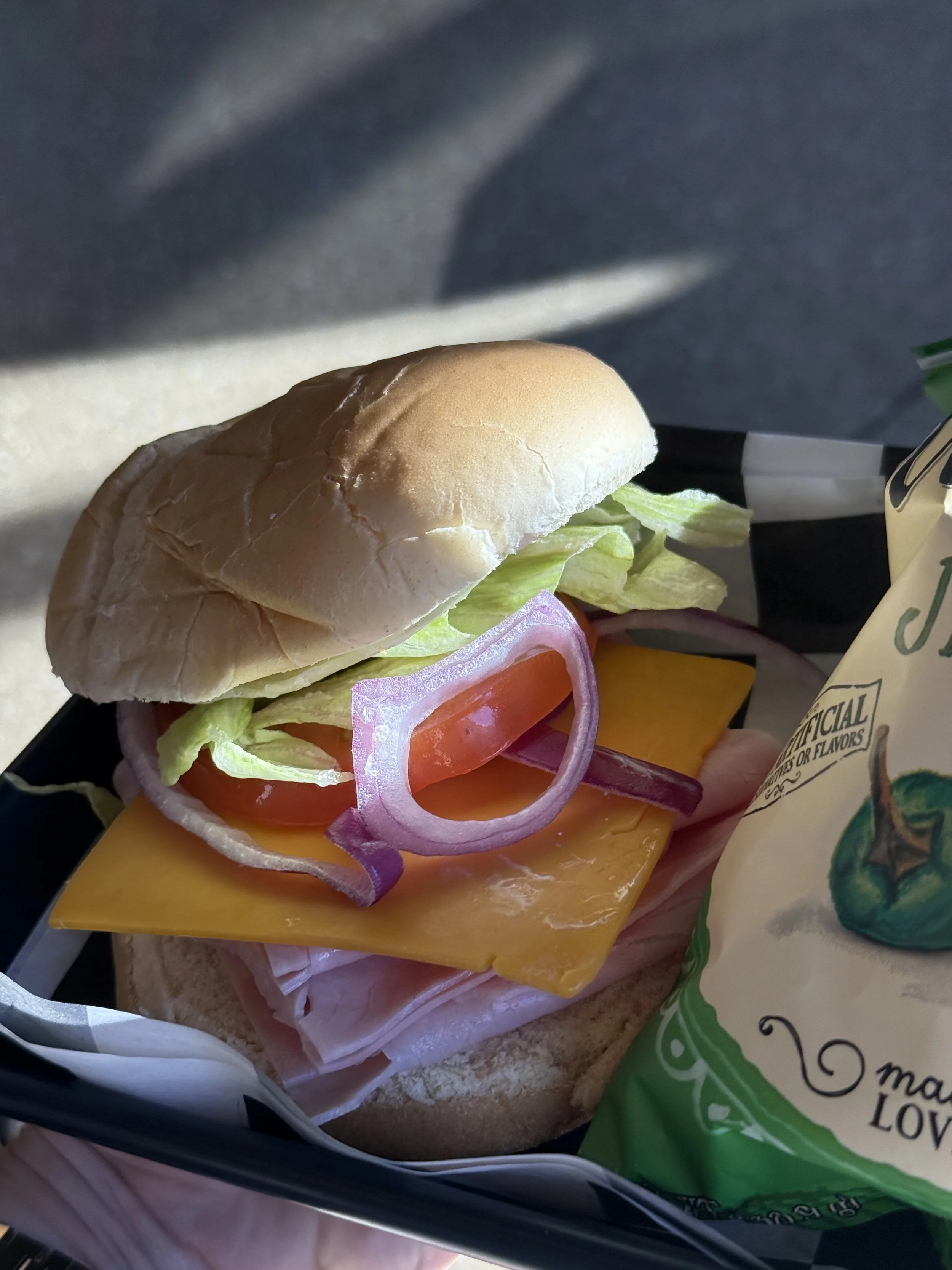 A chilled ham and Cheddar Jack sandwich with lettuce, tomato, red onion, and mayo on a soft French