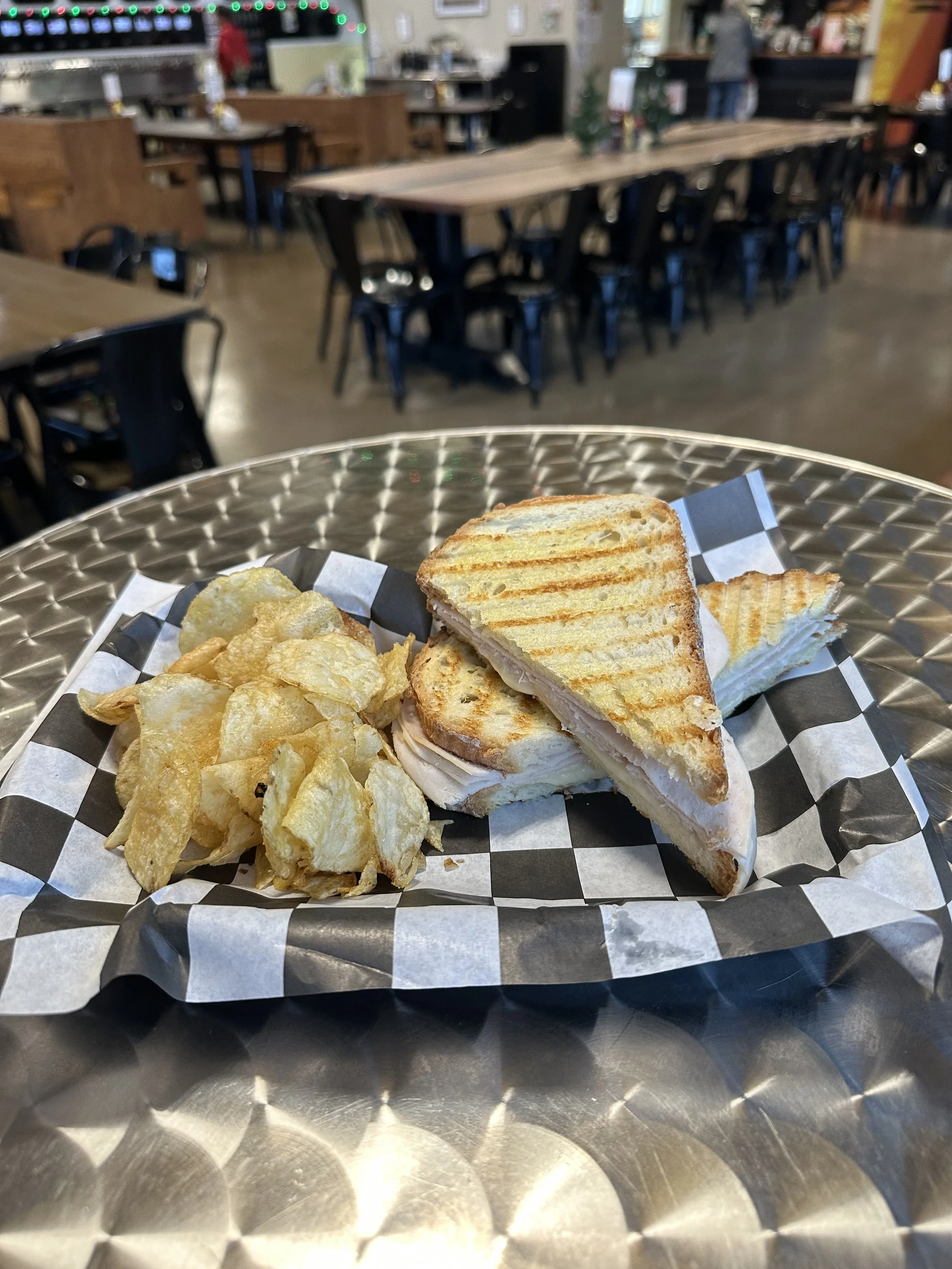 Sliced turkey and melted Swiss cheese pressed into a warm, golden panini served with your choice of chips.—$9